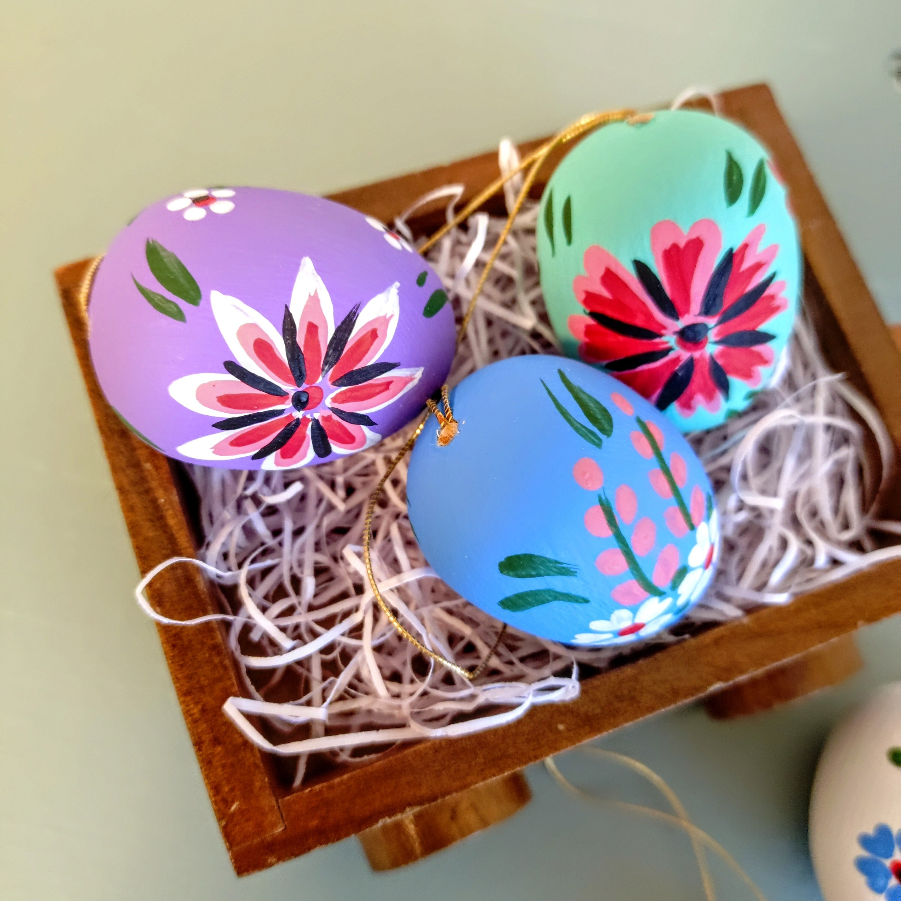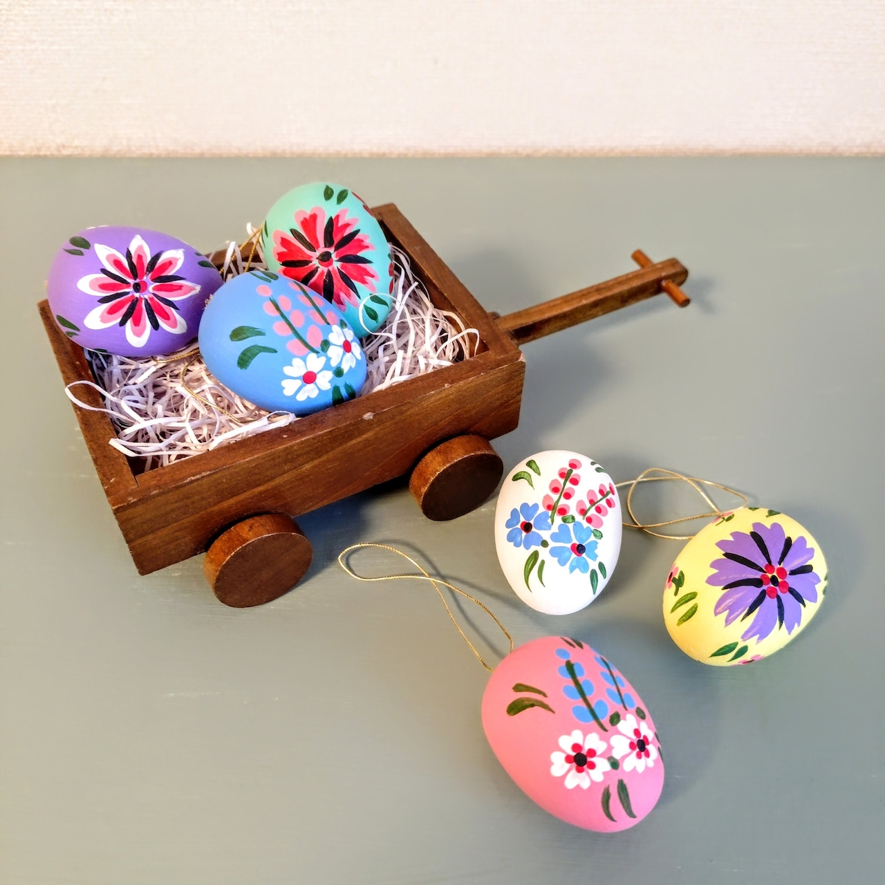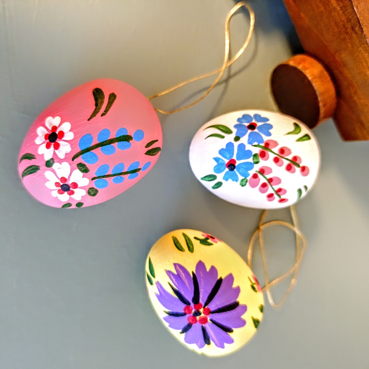 セミマット仕上げで、優しい色合いの木製イースターエッグです