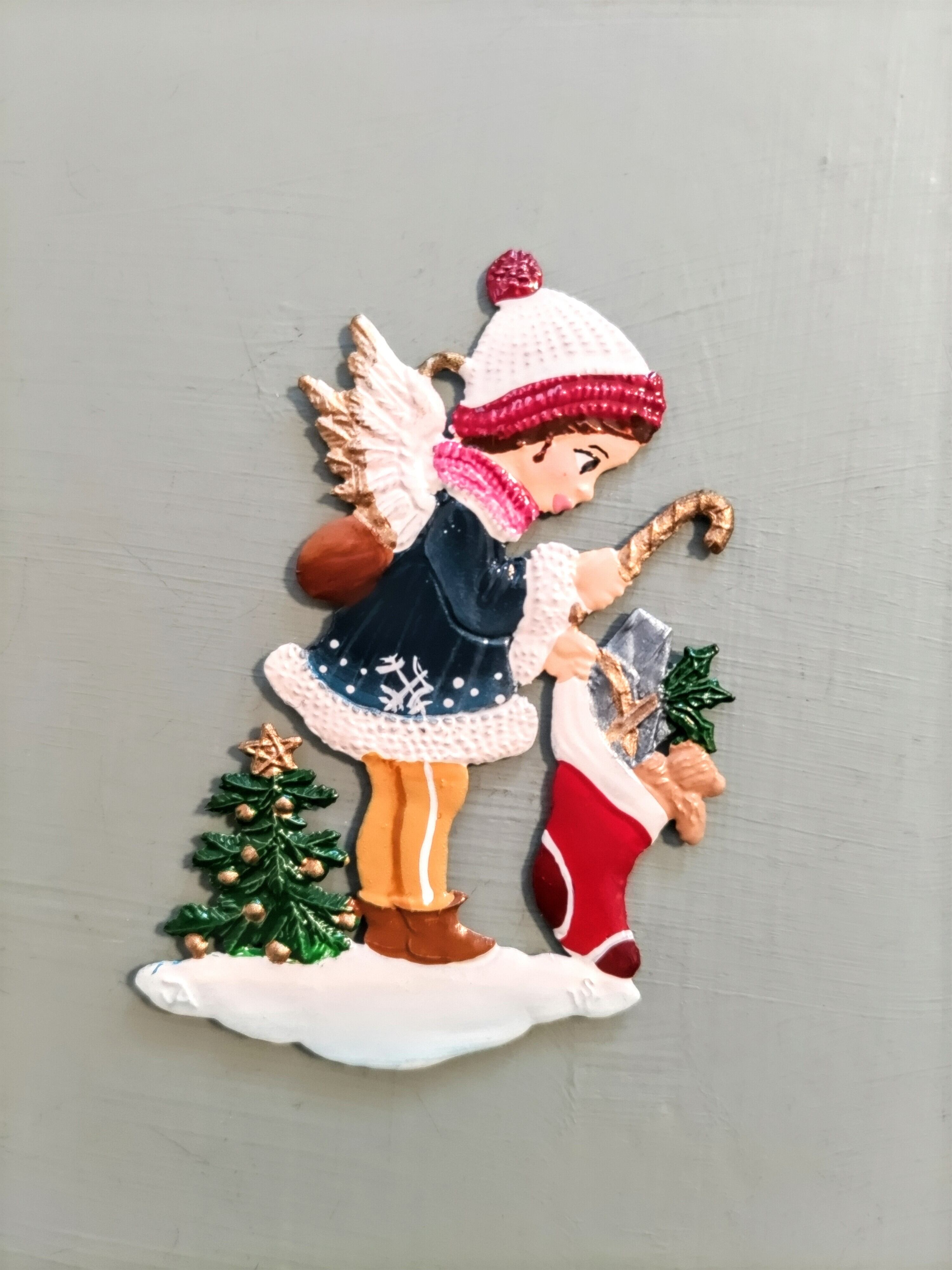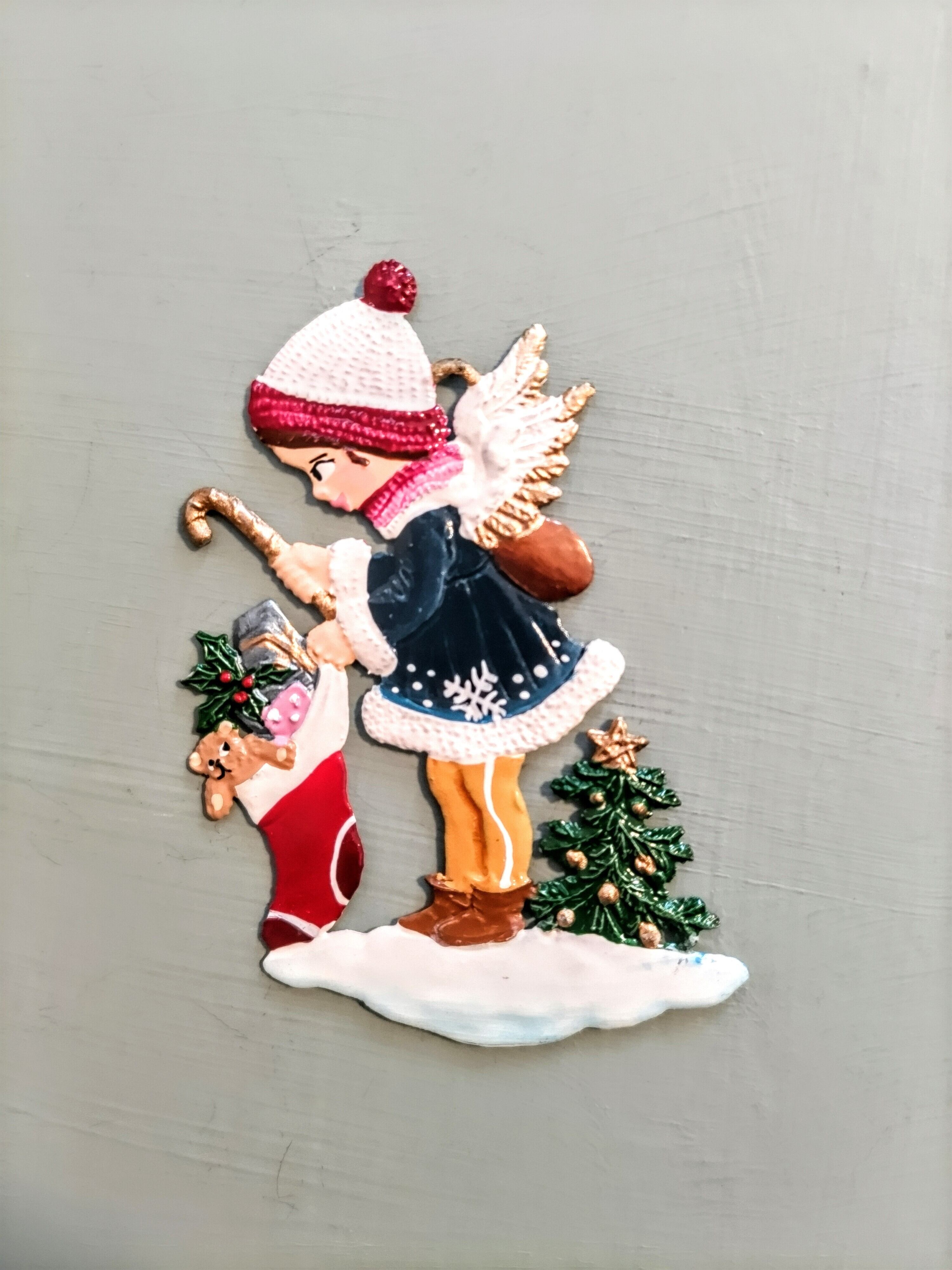ギフトの靴下を持つ天使E 錫飾り オーナメント